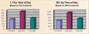 • By time of day, most LTIs and recordable incidents occurred between 09:00 and 16:00 hours.