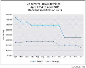 For rigs in the UK, IHS reports that semisubmersibles saw an 80.1% total utilization rate in June 2015, while jackups saw a 78.7% total utilization rate. These numbers are accompanied by sharply falling dayrates. Fixture rates for standard semis – those built before 1983 with a water depth capability of up to 3,000 ft – have decreased from the low $400,000s in April 2014 to around $200,000-$220,000 in April 2015, IHS indicated. Rates have also dropped for standard jackups, from a range of $170,000-$185,000 in April 2014 to $110,000-$151,300 in April 2015.