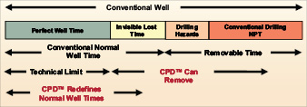 Many drilling-related problems and resulting flat time can be addressed to some degree by precise wellbore pressure management without major disruption to the drilling program and without an increase to the mud weight. This last aspect of conventional drilling is not scrutinized often (also referred to as invisible lost time, ILT). ILT causes NPT and adds to drilling cost by: