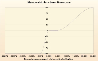 A positive ΔT indicates that MPD is beneficial by reducing drilling time compared with using conventional drilling techniques. Candidacy results can be classified into three categories. First, a negative time saving indicates that conventional techniques might be preferable. Secondly, a significant time saving indicates that MPD techniques are more suitable. In the third category, there are time savings but these are not significant, and further assessment may be required to determine the best drilling application. Fuzzy logic is used to mathematically express partial truth through the use of membership functions.