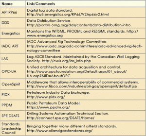 Numerous standards have been defined within the oil industry over the past 20-plus years. Most of them relate to a specific domain, such as drilling, production or geophysics. Oil industry standards that are most applicable to drilling automation include: