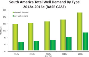 In a report by Quest Offshore Resources, exploration well demand in South America is exponentially higher than development well demand. For both types of wells, demand is expected to increase at least until 2016, with total well numbers reaching over 800 between 2013 and 2016.