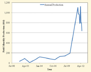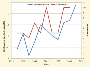 Historical production from the field is characterized by immediate and severe decline. Production over the past decade is only a fraction of the field initial production. This is due to the fact that the field is on primary depletion. However, there has been variation in production year by year over the past decade. Figure 6 summarizes the field production and producing well count from 2000 to 2010.