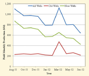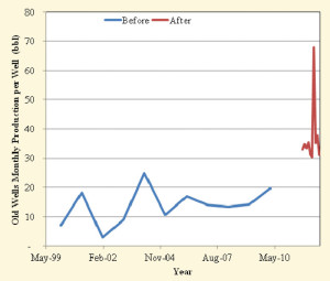 Throughout this time, oil prices were steadily increasing. It is likely that much of the up and down in the well count and modest growth in production was due to the oil price increase and attempts to boost production by optimizing the surface kit.