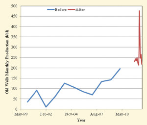 Figure 8 does indicate abnormally high production during March 2012. Just prior to this period, the pumps on the two old wells were replaced. The pump replacement resulted in short-term production benefits that are primarily responsible for the production increase. During June 2012, production from both the old and new wells was down slightly. During this time, there were production disruptions associated with additional infill drilling and bringing those new wells online. The before and after comparison of old well production is shown in Figure 9.
