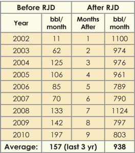 From 2008 to 2010, the field averaged 157 bbl/month from the old wells. For the nine-month period after the RJD/acid fracturing treatment, the wells have averaged 264 bbl/month. However, much of the variation in historical production is due to fluctuating well count. During periods when wells were shut in, production was down. Table 3 summarizes average monthly production per well, and Figure 11 is a plot of this data.