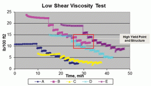 Likewise, if a fluid’s viscosity is reduced too greatly, particularly the low-shear rheology, the fluid may be ineffective at hole cleaning. Therefore, what is needed is a fluid that is resistant to barite sag with reduced viscosity but with adequate hole-cleaning characteristics to lift cuttings out of the wellbore. The fluid must also remain stable and suspend weighting material as well as cuttings while static.