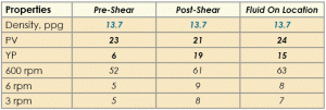 From there, the fluid was in the mud plant, and the high pressure shearing device was employed to fully condition the fluid prior to load out. The fluid was a scratch-built fluid and contained no previously used seed mud. Table 2 shows the fluid properties before and after application of the high-pressure shear. The post-shear result was a fluid with rheology nearly identical to the properties specified by the hydraulics model.