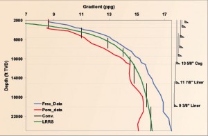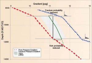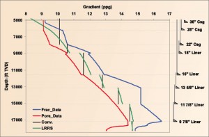 The graph shows that LRRS mud gradients fit better within the operating window. As a result, the probability of loss by exceeding the fracture pressure is significantly reduced, allowing for safer and more efficient drilling. In the real operations of the well, there were substantial problems experienced with loss and gains through several hole sections, likely due to narrow pore and fracture pressure margins.