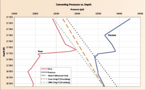 The example illustrated in Figure 6 shows a narrow pore/fracture window in an 8 ½-in. section during cementing operations. The orange line shows the annular pressure profile of 14.2 ppg mud to 17,160 ft and 16.7 ppg cement below to 18,300 ft.