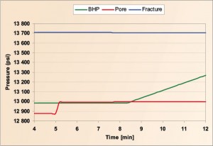 To illustrate kick detection, a simulated case with BHP below the pore pressure is used. Figure 7 shows pressure versus time. The green line represents the BHP. When the influx was detected three minutes after it started, the subsea pump was set to idle, causing the level and the BHP to increase.