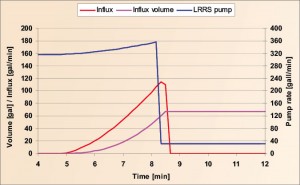 Figure 8 shows the influx flow rate, total gas volume in the well and LRRS subsea pump rate versus time. Since the subsea return pump was set to keep the riser mud level constant, pump speed has increased by 12% after 2 bbls of influx.
