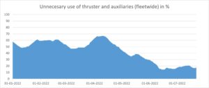 Figure 3 shows a power consumption reduction comparison on a drillship, where it was possible to compare the performance in similar metocean conditions and during similar operations. Figure 4 highlights the impact made on the analytic models when calculating the unnecessary use of thrusters and associated auxiliary systems during the first half of 2022.