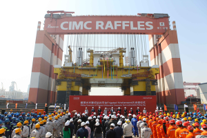 The successful operation was marked at a ceremony in Yantai, in the presence of guests from China and abroad. At a weight in excess of 18,000 metric tons, the lifting operation is one of the heaviest lifts ever undertaken by a conventional crane and it is another demonstration of Yantai CIMC Raffles Offshore’s capabilities and its development towards becoming a leading builder of state of the art offshore drilling rigs.