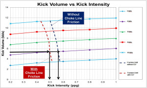 Figure 3 demonstrates a kick tolerance plot for a deepwater well. The X-axis has kick intensity (in ppg equivalent) while drilling, and the Y-axis has kick volume (in bbls). As seen from the plot, volume of a kick that can be circulated out at a given kick intensity or kick tolerance is lowered due to choke line friction. With application of MPD, smaller kicks can be safely circulated out through the riser. This provides better kick tolerance due to the elimination of choke line friction.