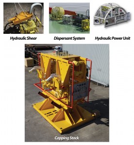 Main components are hydraulic shears to cut the debris around the well. In the event that the rig’s lower marine riser package fails to separate during emergency disconnect, there is a high probability that the riser and other debris will hinder installation of the capping stack onto the primary drilling BOP. The largest of these shears typically has a jaw opening of 46 in.