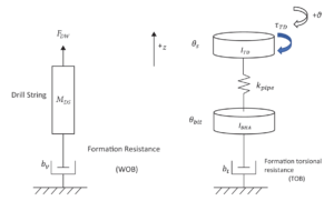 - A torsional stiffness element, which is critical to simulate stick/slip vibration, and the torsional spring will accommodate twisting of a drill string during stick/slip, similar to long drill pipe in a real drilling environment. A thin long rod was used to achieve the same properties of drill pipe.