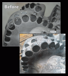 An anti-balling coating is also applied to the steel through a heat treatment. “The outer layer of the steel turns the electrical conductivity of the steel into a negative charge. When you have a water-based mud and the particles in that mud are also negative, they start repelling each other,” he explained. “A build-up of a water surface on the bit face itself helps prevent balling through that process.”