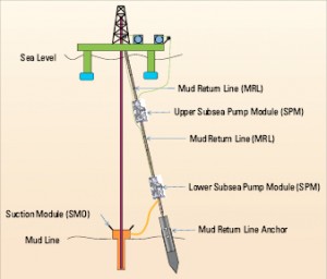Shell, BP America, DEMO2000 and AGR formed a JIP to develop a deepwater version of RMR. This followed an earlier DEMO2000 JIP 6, which developed a jointed steel tubular as the MRL and conducted a field trial in 2004 in harsh North Sea winter weather. The deepwater RMR JIP used the same jointed steel return line philosophy and improved the pumping power, environmental resistance and deployment system to lift the return mud and cuttings from greater depths. Deepwater RMR uses two subsea pump modules (SPMs), each three pump stages, one near bottom and one near mid-water depth (Figure 2).
