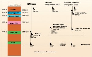 • Control possible shallow gas in Zone 1: Drill through gas hydrate layer at top of Zone 1 and control possible shallow hydrocarbons below. The risk of uncontrolled well flow is lowered with RMR as volume monitoring and precise control over the mud weight in the well is possible. The seabed discharge case for this well included a contingency shallow set of the 13 3/8-in. casing to isolate Zone 1.