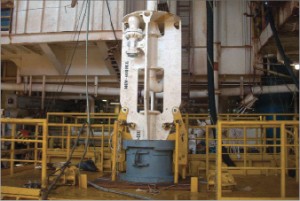 • The conductor casing hang-off frame was modified such that cement ports were manifolded together so that mud and cement could be returned to surface after the surface casing hanger was set. The cement ports were then connected to the suction port of the SMO with an isolation valve to allow easy changeover of returns when the surface casing hanger was set.