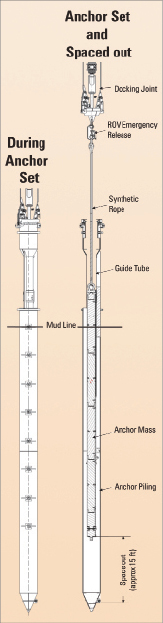 • The MRL anchoring system fixes the bottom end of the MRL to the seabed, holding the MRL away from the well and drillstring to avoid clash. The MRL anchoring system is not designed to restrain the MRL from vertical movement, only horizontal movement to maintain the MRL at a constant distance from the wellhead (Figure 5).