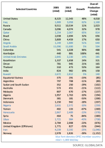 Continued global oil production growth is seen as a key contributor to falling oil prices. Among non-OPEC countries, US oil production has increased by approximately 4 Mbpd, or 48%, since 2005. For the same period, Russia increased production by more than 1 Mbpd, as did Canada.  Within OPEC countries, growth has also been significant in Iraq, which went from nearly 1.9 Mbpd in 2005 to just over 3 Mbpd in 2013.