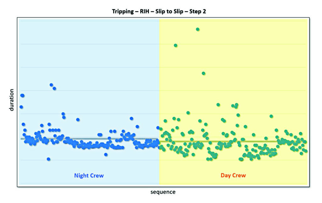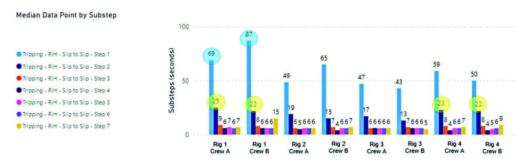 Access to granular data enables assumptions based on experience, but the full understanding of operations variables enables some of the most valuable and actionable insights. This is specifically important when comparing crews to one another. Measuring and tracking tripping performance at a high level, such as looking at overall gross tripping speed, can provide performance indicators. Generating granular sub-steps allows for the identification of exact process variations and impactful discussions when recommending realistic actions to improve safety and efficiency.