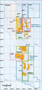 This map of the North Falklands Basin shows license distribution between different companies. The water depth here is generally shallow, less than 450 m, with shallow drilling targets in the range of 1,500 m to 3,000 m. Source: Desire Petroleum.
