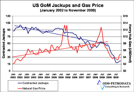 Looking at the very mature US Gulf of Mexico jackup region, he pointed to a trend of rising gas prices and falling jackup utilization that could be seen from 2002 into 2008. “No longer do we have the close correlation between gas prices and jackup activity. And the only obvious explanation and the one I would support is that, this is such a mature market, the prospects are just not there anymore.