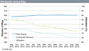 On the jackup side, while demand has declined, the total supply of jackups has grown, with 20 newbuilds entering service in 2015. “The jackup rig supply has been increasing slightly, but it’s been a similar pattern on utilization and demand as the global fleet – basically, both going down,” Mr Kellock commented. As of September 2015, the number of jackups on contract had decreased to 390, down from 450 a year ago.