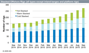 Utilization of the global offshore rig fleet, which totals around 850 units, declined from 85% in September 2014 to 71% in September 2015, according to IHS. “The last 12 months, there was surprisingly little change in supply (but) consistent decrease in demand and utilization across the board. Correspondingly, there were rapidly increasing numbers of stacked rigs but, so far, fairly limited scrapping,” Mr Kellock said. Currently, more than 100 rigs remain in cold stack globally.