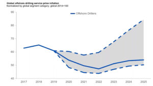 However, forecasting dayrates for 2021 is tricky because the market is so unstable. Mr Childs estimates that, for upcoming contract awards for work starting in 2021, dayrates are likely to fall somewhere in the range of $55,000 to $115,000 for jackups; $150,00 to $325,000 for semis (including harsh-environment semis in Norway); and $160,000 to $275,000 for drillships. Where it falls in that range will depend on the region and specs of the rig, as well as timing of the work.
