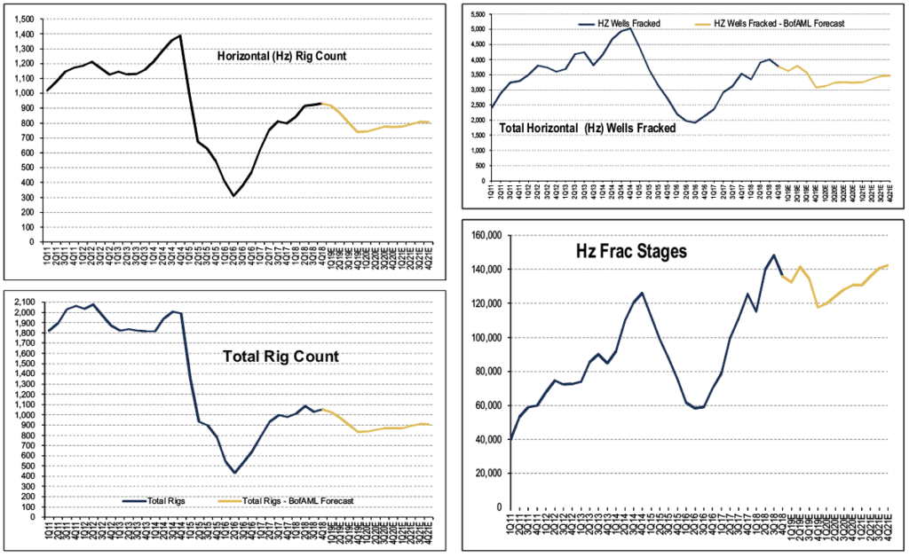 The expected reduction in rig activity means that the number of wells drilled and completed will also fall next year – Mr Mulvehill expects it to decline by 9%. He also anticipates the number of frac stage counts to fall by 5% even as lateral lengths increase.
