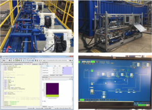 Clockwise from top left: Mixing unit; RheoSense skid; control system interface; downhole model/set-point algorithm.