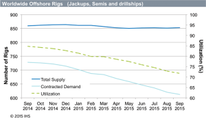 Offshore, the overall supply of rigs has remained fairly steady for the past year at around 850. Total rig utilization, however, has tumbled from 85% in September 2014 to 71% in September 2015, according to IHS, with the number of contracted rigs falling to approximately 600. That’s compared with 725 contracted floaters and jackups in fall 2014.
