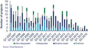 Similar to onshore, the number of offshore wells drilled is expected to be lower this year compared with 2014, and the biggest driver here is a drop-off in shallow-water development drilling offshore Thailand. “Last year, Chevron drilled 585 wells in the Gulf of Thailand,” Mr Cook explained. With a lower operating budget this year amid low prices, that number is certain to decline.