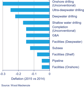 He points out that a contracted service sector would cause E&P companies to lose purchasing power and, in the end, would likely lead to just an average 10-15% reduction in costs from the supply chain, Wood Mackenzie estimates. But analyses show that the industry actually needs 20-30% in cost reductions to make the at-risk upstream projects economically viable again. “When companies have purchasing power, they have the ability to go out and drive a good price for the services they want,” Mr Webb said. “In the event of an oil price recovery, or uptick in activity, you could see a reversal of this deflation environment, where prices start to rise again just because the service sector has contracted so much.”