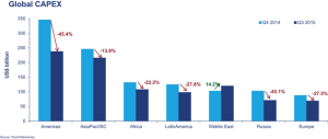 In response to dramatically lower oil prices this year, upstream capital investment is now expected to decline by a total of $220 billion over 2015 and 2016 compared with pre-downturn projections, Mr Webb said. Already, a total of 46 conventional projects have been deferred since 2014. Many of these were “projects that didn’t work or struggled to work out at $100 per barrel, like the Canadian oil sands,” he explained.