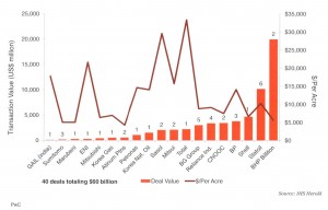International investment in US shales is leading the M&A world, with 40 deals completed in the past four years, including 33 in the last two years alone, totaling $60 billion. From European to Chinese to Indian companies, “there isn’t hardly an international company missing, other than the Russians,” Mr Roberge said. “Twenty-two of those 40 deals have been joint ventures (JVs), where international companies pay all the CAPEX and the US independent gets carried fully.”