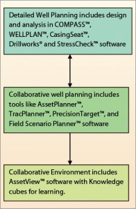 The end product of collaborative well planning is the field development plan. After well plans have been developed, they can be validated for torque and drag, anti-collision and other design considerations through use of applications software. Figure 3 illustrates this workflow. For a field development plan where hundreds of wells are needed, footage drilled and pad locations can also be optimized to hit the maximum number of targets.
