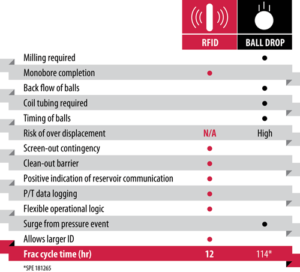 In hydraulic fracturing applications, RFID-enabled isolation devices avoid the need for balls and seats or plug-and-perf operations. As Figure 1 shows, ball-drop systems offer limited options during screenouts and must be milled out after stimulation is complete, adding rig time and cost to the process. The absence of ball seats in RFID tools yields a uniform inside diameter that makes it possible to run any number of tools in sequence. Additionally, the RFID system’s ability to accurately indicate tool function and provide screenout contingences reduces uncertainty, enabling improved financial risk planning in offshore and other high-cost environments. Finally, when the two methods are compared in offshore tight-gas applications – where an aggressive tip-screenout philosophy makes screenouts more likely – the frac cycle time is significantly lower using RFID-enabled tools, which lowers OPEX.