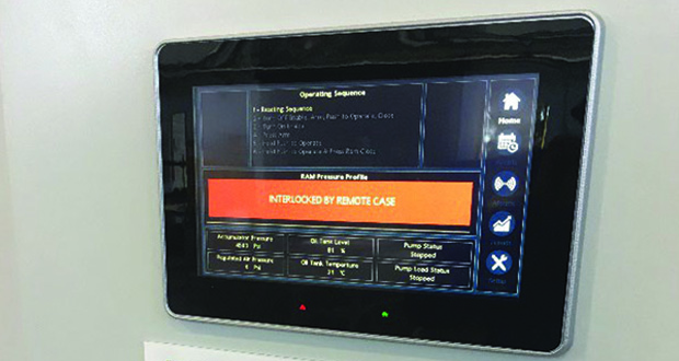 The system hardware is described in Figure 5. An additional set of rams (item 2) is added to the stack and connected to a dedicated hydraulic power unit (HPU) (item 7), which in turn is connected to a wireless base station with local controls (item 8). The base station is situated at the rig site and contains the PLC, HMI and radio telemetry device. The base station acts as a monitoring point for the HPU and controls and as a secondary control station. It allows the ram open function, operationally required for system testing and training. Additionally, the base station hosts a UPS and a user display showing key operating parameters, such as ram close pressure (trend), ram open pressure and accumulator pressure.