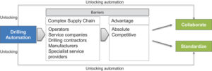 The main drivers forcing vendors’ behavior is that the drilling industry has a very complex supply chain with a large number of players and significant competitive and absolute advantage associated with drilling automation. This results in the industry’s reluctance to collaborate as major players already have a well-established market position while smaller players might be running the risk of becoming redundant or being absorbed by larger companies due to their potential impact on the supply chain. The obstacles to genuine collaboration have a major impact on the ability of the industry to achieve full drilling process automation and create a range of challenges for operators and drilling contractors (Figure 2).