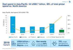 Asia-Pacific upstream deal spend hit $8.7 billion last year, accounting for over a third of global spend, excluding North America. This increase in activity was primarily driven by a reshuffling of portfolios in Australia and New Zealand. However, Southeast Asia is set to feature more prominently in 2019, with more than 5.4 billion BOE of predominantly gas assets potentially coming to market.