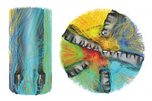 Cutter design and placement have been optimized in the new bit as has its hydraulic performance. Nozzles are placed to provide maximum cutter cleaning and sweeping of drill cuttings up and out through the expanded junk slots. This prevents wasteful regrinding of cuttings that robs energy from penetrating new rock (Figure 2).