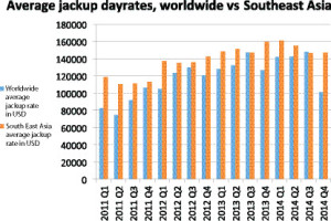 According to IHS data, jackup rates for new fixtures in Southeast Asia have generally tracked above those of the rest of the world in recent years.