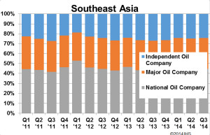 It’s apparent that majors hold a larger proportion of rig contracts in Southeast Asia while independents hold a bigger share in other parts of the world. Percentages for contracts from NOCs, meanwhile, are comparable, according to these IHS charts.