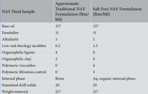 The new salt-free, non-aqueous fluid uses a proprietary biodegradable organic that replaces brine as the internal phase. The internal phase was premixed prior to its addition to the fluid, much like a traditional NAF formulation. All other additives were added to the fluid as received. A typical NAF formulation and comparative salt-free NAF formulation is shown in Table 1.