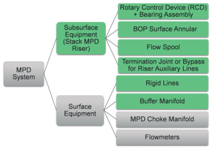 The MPD-ready rig customizations require an enormous amount of rig modifications and a group of appropriated equipment to make the operation possible. For a better understanding and project management, two major subgroups were created to classify the MPD system. The equipment may be divided into surface equipment and subsurface equipment, and these two categories each face different challenges.